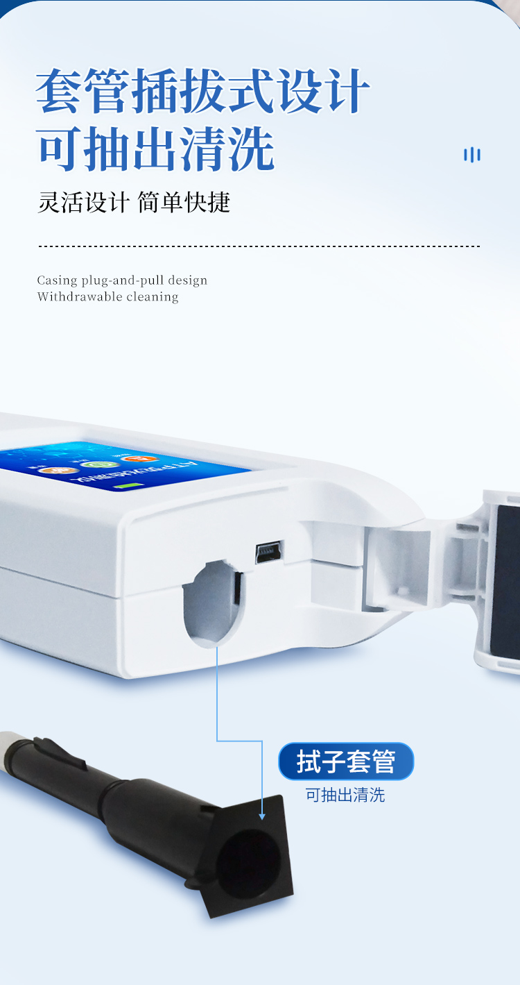 該設(shè)備采用生物化學(xué)反應(yīng)方法檢測ATP含量,ATP熒光檢測儀基于螢火蟲發(fā)光原理,利用“熒光素酶—熒光素體系”快速檢測三磷酸腺苷(ATP)。ATP拭子含有可以裂解細(xì)胞膜的試劑,能將細(xì)胞內(nèi)ATP釋放出來,與試劑中含有的特異性酶發(fā)生反應(yīng),產(chǎn)生光,再用熒光照度計(jì)檢測發(fā)光值,微生物的數(shù)量與發(fā)光值成正比,由于所有生物活細(xì)胞中含有恒量的ATP,所以ATP含量可以清晰地表明樣品中微生物與其他生物殘余的多少,用于判斷衛(wèi)生狀況。