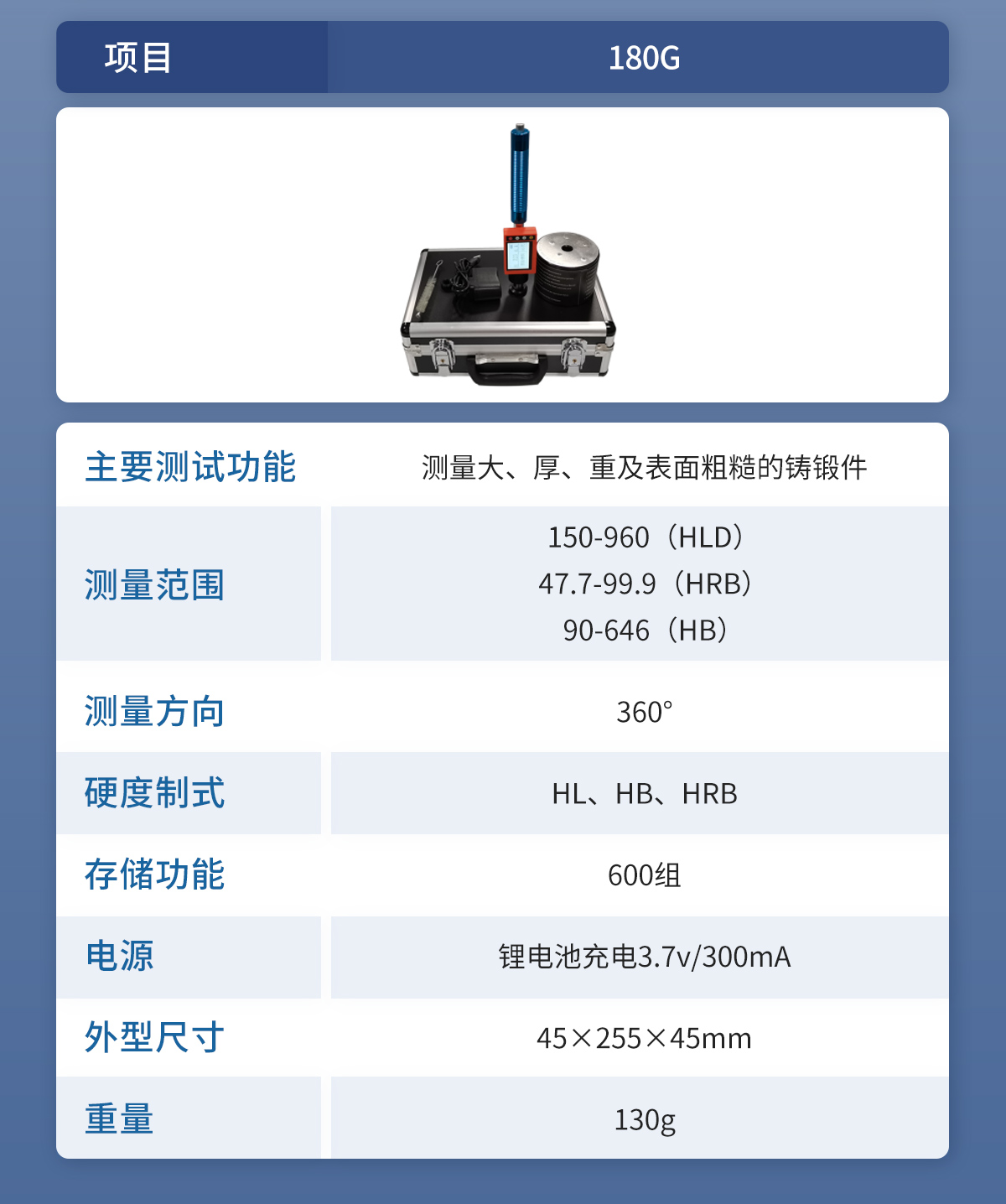 | 測(cè)量范圍 | (127~651)HB,(59.6~99.6)HRB,(17.9~68.5)HRC,(59.1~85.8)HRA,(83~976)HV,(32.2~99.5)HS,(150-960)HLD,可定制測(cè)量值范圍 |