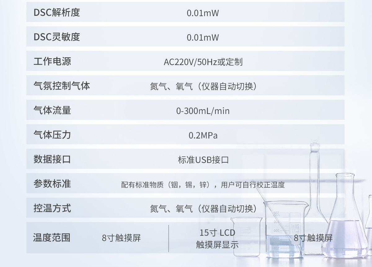 1.溫度范圍: 室溫~500℃ 2.溫度分辨率: 0.01℃ 3.溫度波動: ±0.1℃ 4.溫度重復(fù)性: ±0.1℃ 5.升溫速率: 0.1~100℃/min 6.恒溫時間:建議<24h 7.控溫方式:升溫,恒溫(全自動程序控制) 8.DSC量程: 0~±600mW 9.DSC解析度: 0.01mW 10.DSC靈敏度: 0.01mW 11.工作電源: AC220V/50Hz或定制 12. 氣氛控制氣體:氮氣、氧氣(儀器自動切換) 13.氣體流量:0-300mL/min 14.氣體壓力:0.2MPa 15.顯示方式: 8寸 LCD觸摸屏顯示,超硬度儀器面膜設(shè)計。