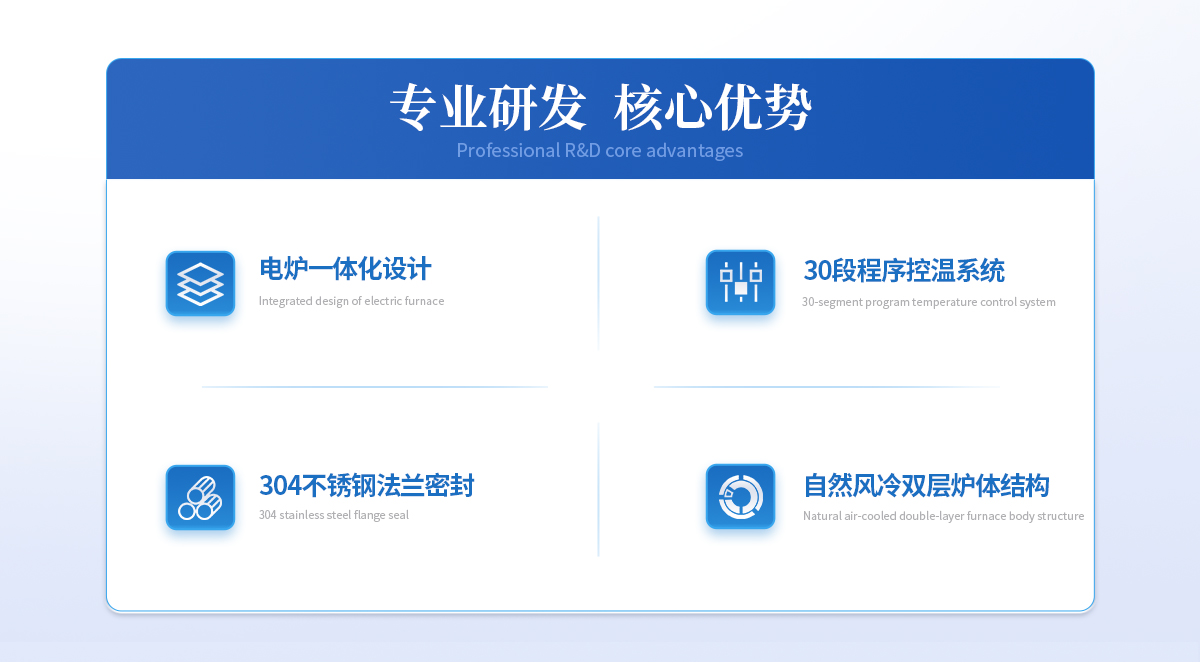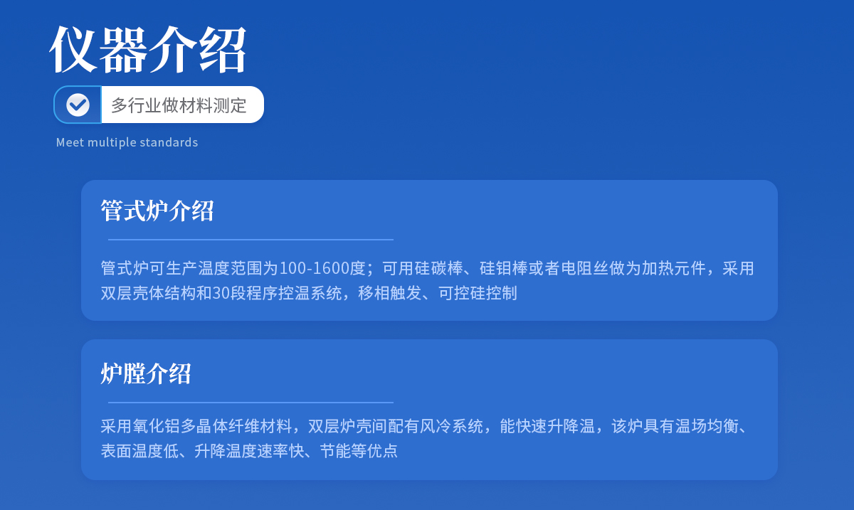 | 1、爐膛采用優(yōu)質(zhì)氧化鋁纖維材料,保溫性能好,耐用,拉伸強度高,無雜球,純度高,節(jié)能效果明顯; | 2、加熱元件采用優(yōu)質(zhì)HRE電阻絲,大大提高了其使用壽命; | 3、超溫報警,漏電保護(hù),操作安全可靠。 |