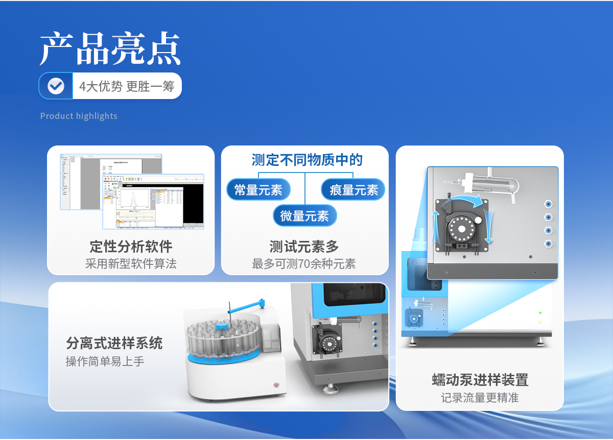 1、測試元素多,*多可測 70 余種元素。 2、多元素同時(shí)測試,一次進(jìn)樣所有元素同時(shí)測試。 3、分析速度快,每分鐘約 5 個元素,*快測試速度可到每分鐘 10 個元素。 4、檢出限低,絕大多數(shù)元素可達(dá) ppb 級。 5、線性范圍寬,可達(dá) 5-6 個數(shù)量級,可以實(shí)現(xiàn)高低含量同時(shí)測試,無需更換標(biāo) 準(zhǔn)曲線。 6、化學(xué)干擾少,測試結(jié)果更加精準(zhǔn)。