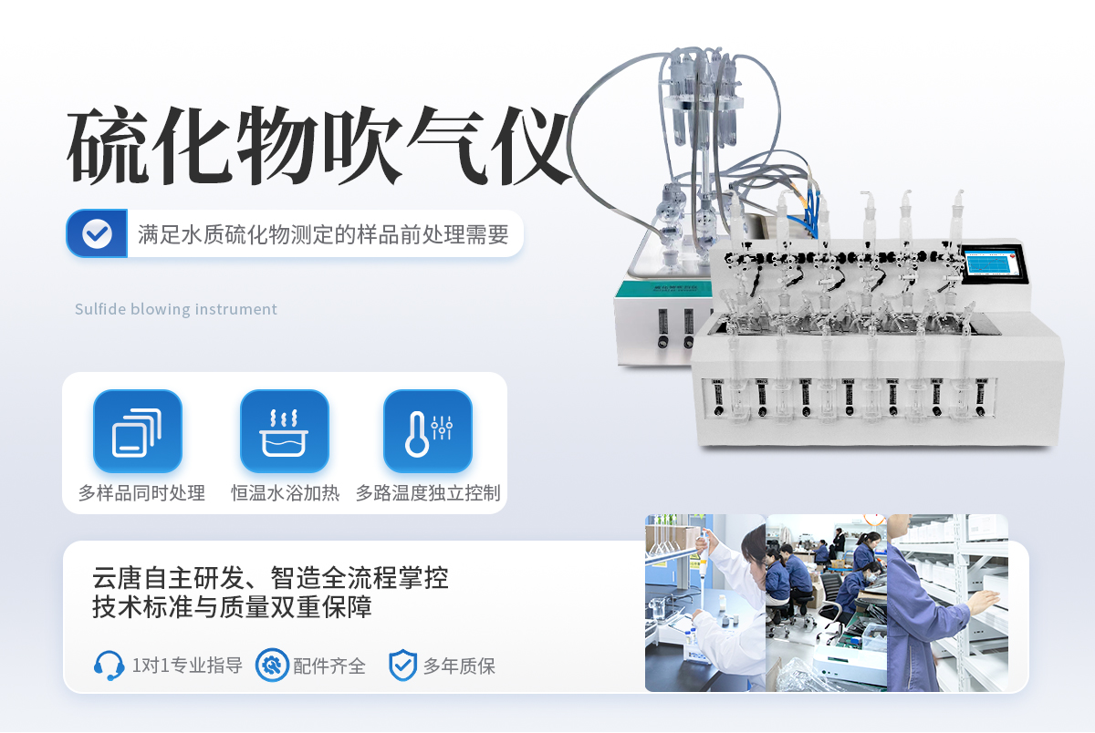 水樣中的硫化物經(jīng)酸化,生成的硫化氫隨載氣(氮氣)進入吸收瓶/吸收顯色管中被吸收溶液(乙酸鋅-乙酸鈉溶液或2%氫氧化鈉溶液)吸收,選擇相應(yīng)的分析方法對吸收瓶/吸收顯色管中吸收的硫離子進行分析測定。水質(zhì)硫化物酸化吹氣儀根據(jù)2022年新國標(biāo)水質(zhì)硫化物的測定-亞甲基藍(lán)分光光度法(典量法)標(biāo)準(zhǔn)開發(fā)生產(chǎn)的。水質(zhì)硫化物測定的樣品前處理需要。