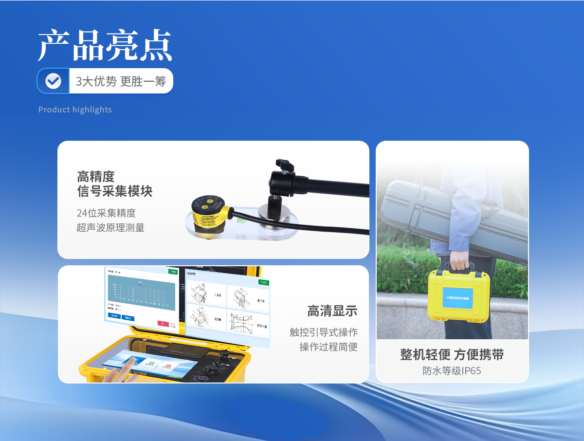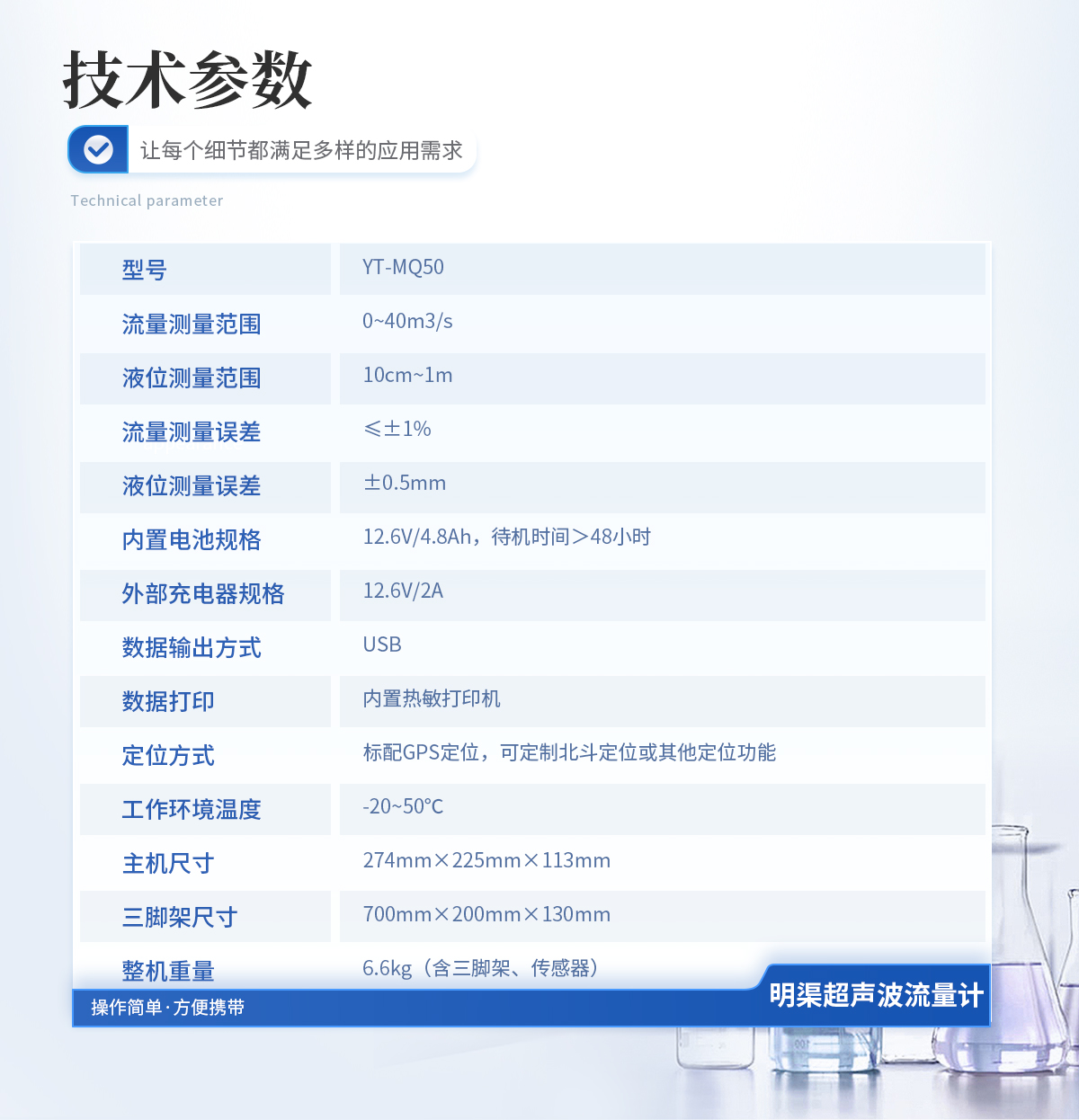 流量測量范圍 0~40m3/s 流量測量頻次 3次/秒 液位測量誤差 ≤0.5mm 流量測量誤差 ≤±1% 液位分辨率 0.1mm 探測距離 標配1米,可選配2米 信號輸出方式 USB 工作環(huán)境濕度 ≤85% 工作環(huán)境溫度 -20℃~+50℃v 工作電源 AC220V ±15% 內(nèi)置電池 16.8V/2.6Ah 電池供電連續(xù)工作時間 >72 小時 外形尺寸 270mm×215mm×105mm 整機重量 2.4Kg