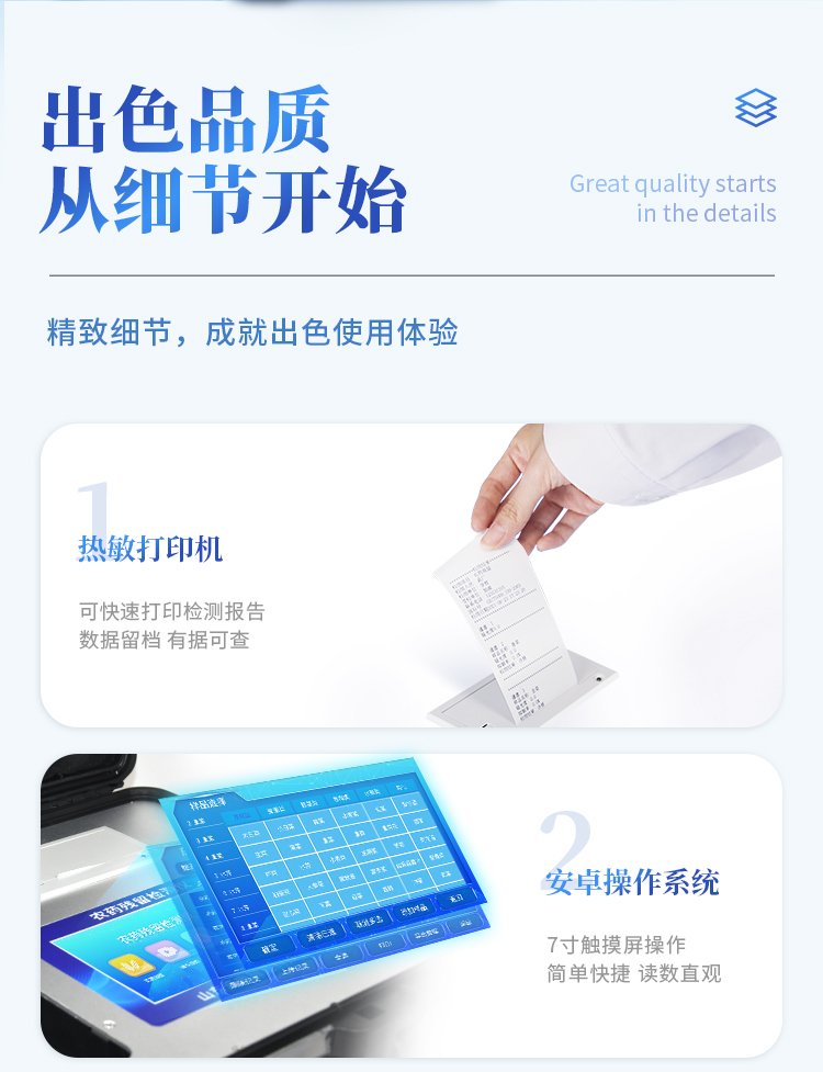安卓智能操作系統(tǒng),采用更加**和人性化操作,儀器具有無線聯(lián)網(wǎng)上傳功能,快速上傳數(shù)據(jù),進(jìn)行數(shù)據(jù)統(tǒng)計和分析。智能化程度高,儀器具有自檢功能:具有開機自檢和調(diào)零功能,具有自動檢測重復(fù)性功能;同時,檢測完成可自動打印檢測報告和二維碼。手機掃碼可顯示出詳細(xì)檢測信息。儀器帶有監(jiān)管平臺,數(shù)據(jù)可局域網(wǎng)和互聯(lián)網(wǎng)數(shù)據(jù)上傳,檢測結(jié)果直接傳至食品安全監(jiān)管平臺。進(jìn)行區(qū)域食品安全監(jiān)管及大數(shù)據(jù)分析處理與數(shù)據(jù)統(tǒng)計,檢測區(qū)域食品安全長短期動態(tài),達(dá)到食品安全問題預(yù)估、預(yù)警 。樣品處理簡單省力,整體操作快速、安全、便捷。儀器具有自身保護(hù)功能,可設(shè)置用戶名及密碼,防止非工作人員操作等。內(nèi)置強大的數(shù)據(jù)庫,可在儀器上直接選擇樣品名稱、檢測指標(biāo)、送檢單位等信息,也可在儀器上直接編輯錄入樣品名稱、檢測指標(biāo)、送檢單位等信息并保存進(jìn)樣品數(shù)據(jù)庫,方便后期操作調(diào)取使用。儀器具有重新校準(zhǔn)、鎖定、恢復(fù)出廠設(shè)置功能。