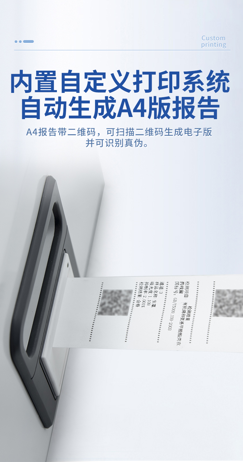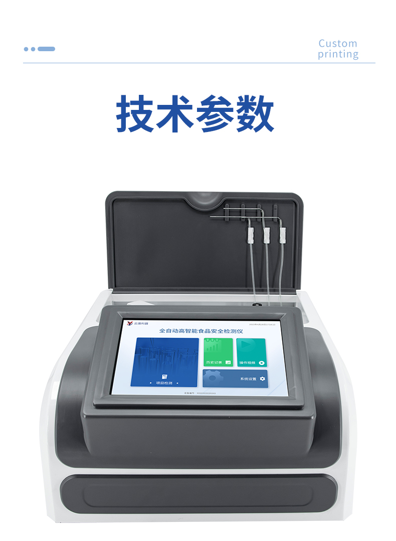 | 1. 試劑位置:3個 | 2. 檢測形式:旋轉(zhuǎn)48通道比色盤,可任意選擇檢測通道,自動對應(yīng)選擇通道。 | 3. 系統(tǒng)配置:10.1寸高清液晶觸摸屏,采用ARM Cortex-A7,RK3288/4核處理器,運行內(nèi)存1GB。Android7.1.1 系統(tǒng)分辨率1280×800。 | 4.恒溫系統(tǒng):具有自動加溫溫控系統(tǒng),精準(zhǔn)恒溫37℃,精度±0.1℃。 | 5.添加系統(tǒng):儀器按照試劑要求自動、按時、按量加入試劑,并且自動對未正常放置的樣本或異常的樣本進行檢查并提示。 | 6.清洗功能:儀器具備回流及自動清洗管路功能,避免試劑污染。 | 7.混勻功能:設(shè)備具備自動混勻功能。 | 8.光源校準(zhǔn):設(shè)備可自動校準(zhǔn),確保檢測準(zhǔn)確度。 | 9.實時監(jiān)控:儀器測試過程中屏幕顯示運行狀態(tài),可實時查看。 | 10.數(shù)據(jù)存儲:內(nèi)部存儲16GB,可存儲500萬條數(shù)據(jù)。 | 11.樣品多選功能:設(shè)備具備樣品一鍵多選功能,選擇樣品自動匹配檢測通道。 | 12.項目預(yù)設(shè):可提前設(shè)置單個及多個相同或不相同的檢測任務(wù),可單次或者多次調(diào)取,減少檢測時間。 | 13.自定義打印系統(tǒng):內(nèi)置自定義打印系統(tǒng),可按需靈活設(shè)置開啟或關(guān)閉:產(chǎn)品合格證(國家農(nóng)業(yè)部標(biāo)準(zhǔn)),二維碼,抽樣信息、檢測信息,受檢信息等信息的打印。 | 14.A4版本報告打印功能:設(shè)備可自動生成A4版報告,A4報告帶二維碼,可掃描二維碼生成電子版,并可識別真?zhèn)巍?/td> | 15.傳輸方式:儀器配備無線通信模塊: 4G(APN)通訊模塊、Wifi模塊,藍(lán)牙傳輸模塊,同時具有USB接口以及RJ45接口能以多種方式實現(xiàn)數(shù)據(jù)保存和數(shù)據(jù)傳輸功能,設(shè)備數(shù)據(jù)可以同步上傳至平臺。 | 16.數(shù)據(jù)監(jiān)管系統(tǒng):設(shè)備自帶監(jiān)管平臺,并可同步對接監(jiān)管平臺,數(shù)據(jù)可局域網(wǎng)和互聯(lián)網(wǎng)數(shù)據(jù)上傳,檢測結(jié)果可直接傳至食品安全監(jiān)管平臺。達(dá)到食品安全問題預(yù)估、預(yù)警。 | 17.系統(tǒng)遠(yuǎn)程更新功能:無需設(shè)備返廠,即可遠(yuǎn)程實時升級全新系統(tǒng),節(jié)省時間成本及避免運輸造成設(shè)備損。 |