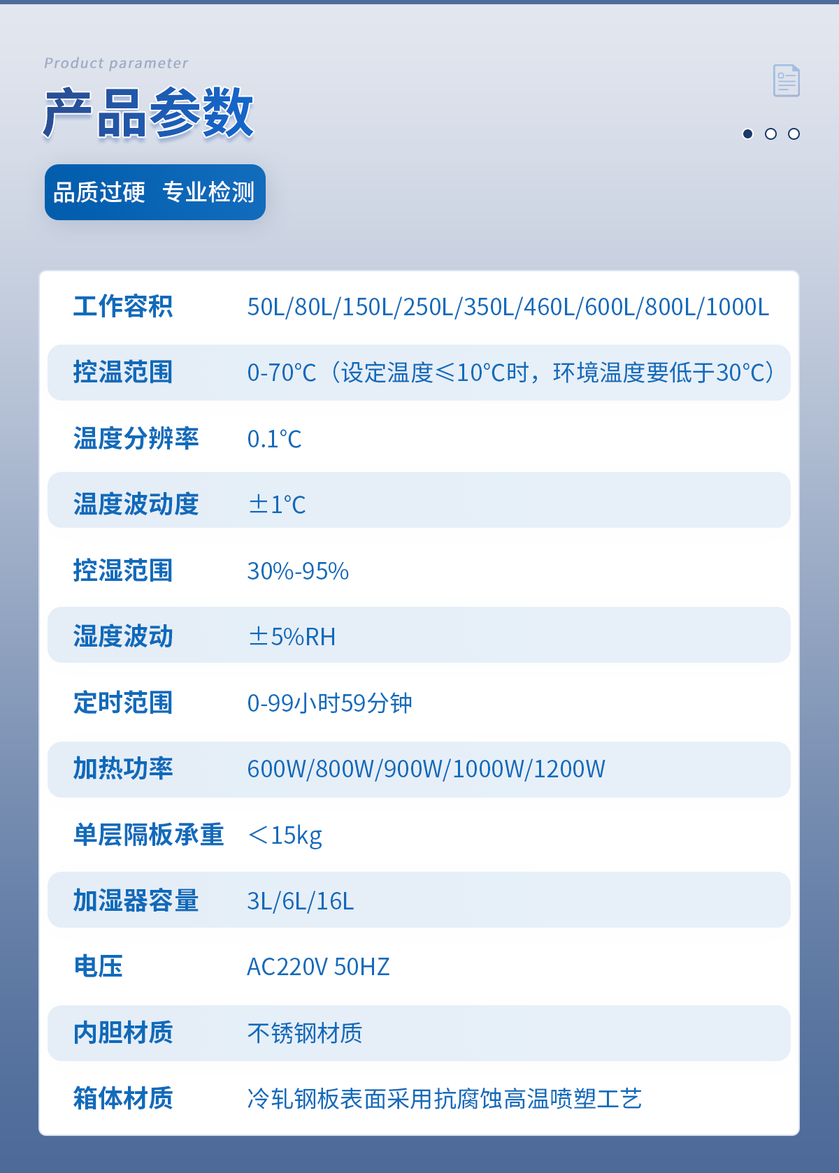 工作容積:360L控溫范圍:0-70℃(設定溫度≤10℃時,環(huán)境溫度要低于30℃)程序控制:24段溫度分辨率:0.1℃溫度波動度:±0.5℃控濕范圍:30%-95%濕度波動:±5%RH定時范圍:0-99小時59分鐘加熱功率:900W內(nèi)箱尺寸 寬*深*高(cm):60*60*100外箱尺寸 寬*深*高(cm):77*84*162隔板層數(shù)(標配):2層層間隔/mm:43卡槽層數(shù):15加濕器容量(標配):3L單層隔板承重:<22kg底部總承重:35kg電壓:AC220V 50HZ整機重量:112kg內(nèi)膽材質(zhì):8K鏡面不銹鋼箱體材質(zhì):冷軋鋼板表面采用抗腐蝕高溫噴塑工藝旗艦款升級項目:升級內(nèi)置鋼化玻璃門,內(nèi)置220V電源插座。