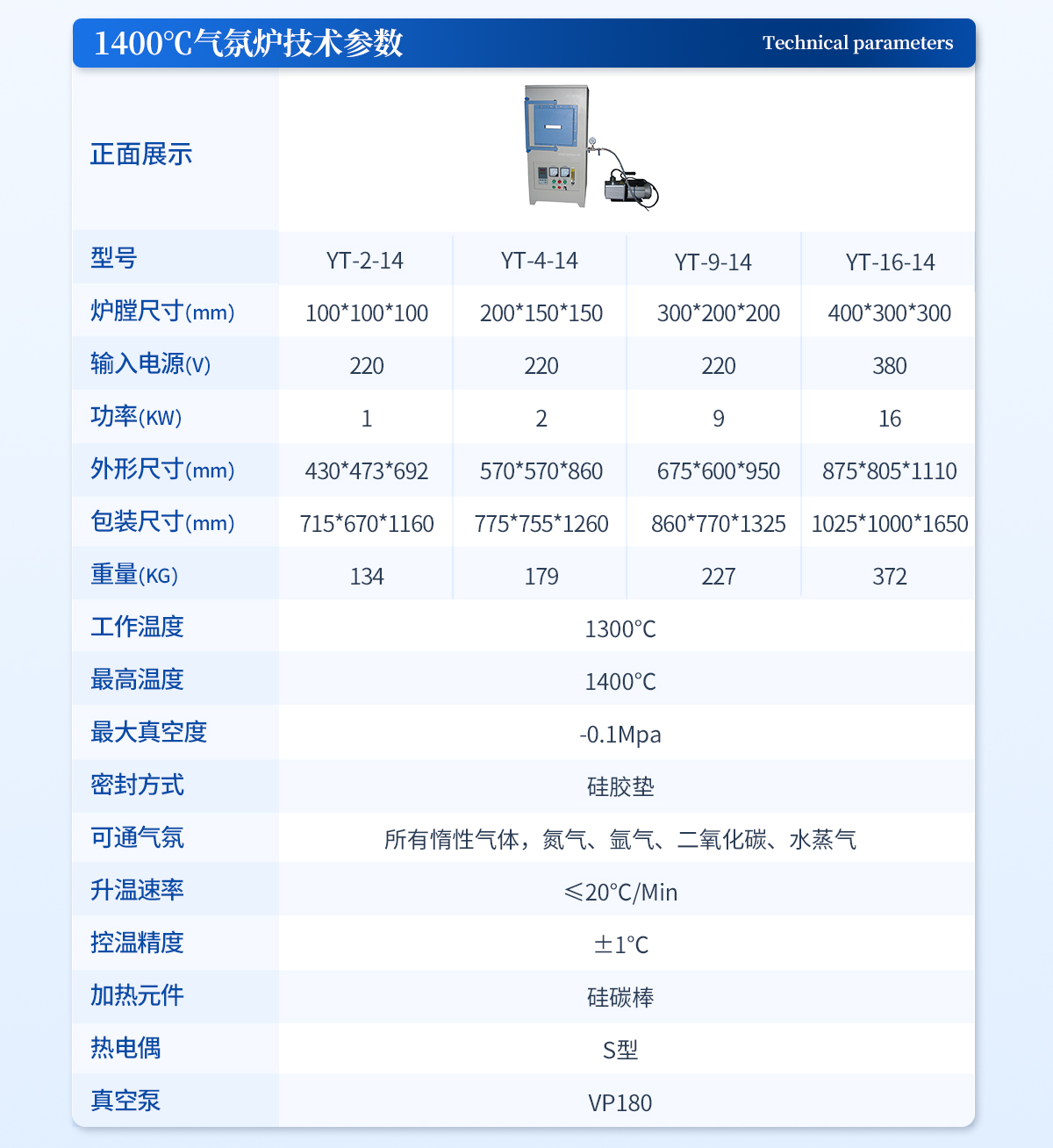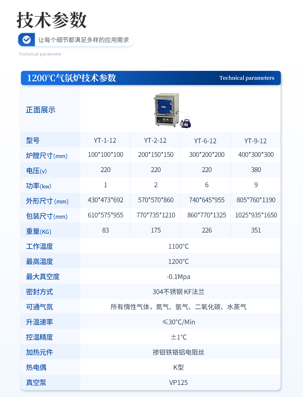 工作溫度:1100℃**溫度:1200℃**真空度:-0.1Mpa密封方式:304不銹鋼 KF法蘭可通氣氛:所有惰性氣體,氮氣、氬氣、二氧化碳、水蒸氣升溫速率:≤30℃/Min控溫精度:±1℃加熱元件:摻鉬鐵鉻鋁電阻絲熱電偶:K型工作電壓:220V 50HZ功率:1KW真空泵:VP125