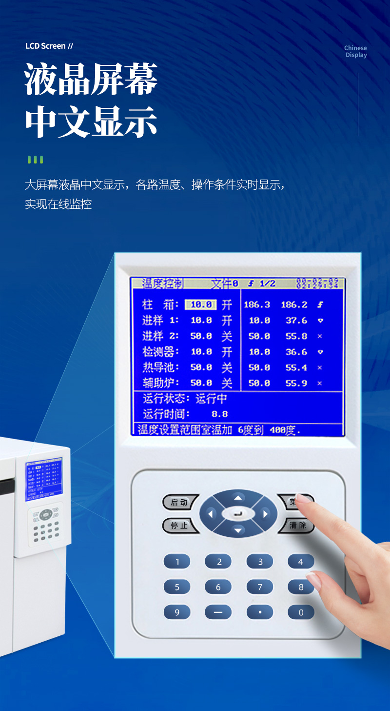 ● 中、英文切換顯示技術(shù),5.7寸液晶大屏幕(320*240)。多達20個顯示界面,信息量豐富,可儲存20套色譜分析數(shù)據(jù),并可隨時調(diào)用。