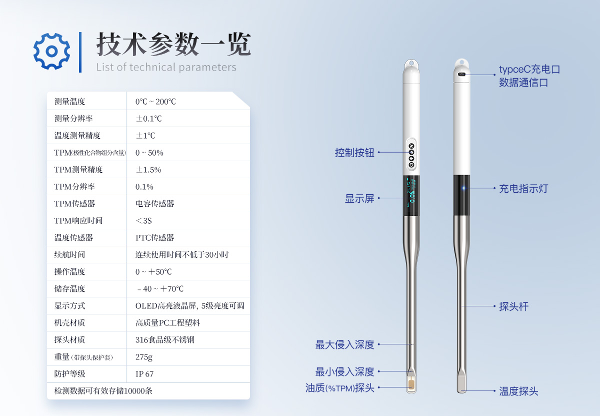 食用油脂是人們攝取能量和營(yíng)養(yǎng)的重要來源,是加工食品的重要原料。油炸食品以其特有風(fēng)味廣受消費(fèi)者喜歡。用于煎炸的食用油在高溫煎炸過程中發(fā)生一系列的物理、化學(xué)變化,這些變化會(huì)生成對(duì)身體健康有害的物質(zhì)。目前,煎炸食用油的傳統(tǒng)檢測(cè)方法多為化學(xué)方法,這些方法必須在實(shí)驗(yàn)室內(nèi)由專業(yè)人員操作,費(fèi)時(shí)費(fèi)力,化學(xué)試劑的使用可能會(huì)傷害檢測(cè)人員健康,且化學(xué)廢劑污染了環(huán)境。LH-SYP是一種快速,安全,**食用油品質(zhì)檢測(cè)儀,能夠快速檢測(cè)食用油中的極性化合物組分(TPM)含量。本產(chǎn)品能夠在油溫較高的環(huán)境下使用,適用于各種煎炸的食用油品質(zhì)檢驗(yàn)。