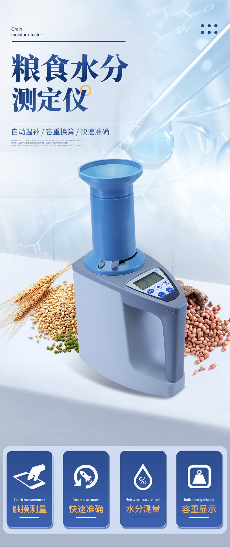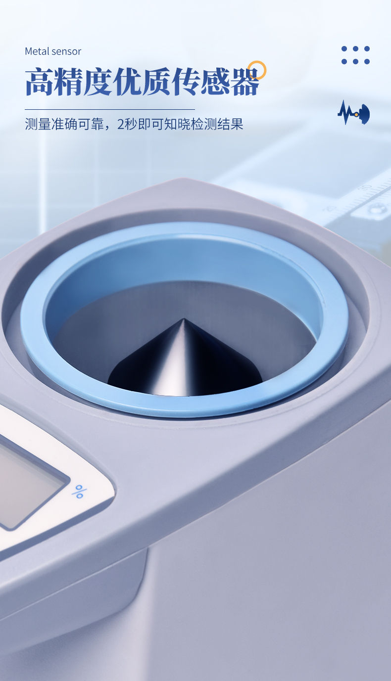 操作簡單:20個常見品種已預(yù)先定標,不需秤樣、用料簡取樣后可立即測量水分