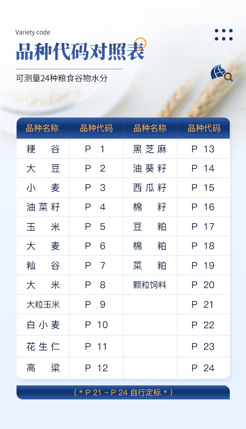 測量范圍:可測量谷類、玉米、東北玉米、大麥、小麥、白小麥、大米、豆粕、花生仁、菜粕、高粱、黑芝麻、棉籽、棉粕、秈谷、大豆、油菜籽、飼料、蔬菜種子等非金屬顆粒狀物質(zhì)。