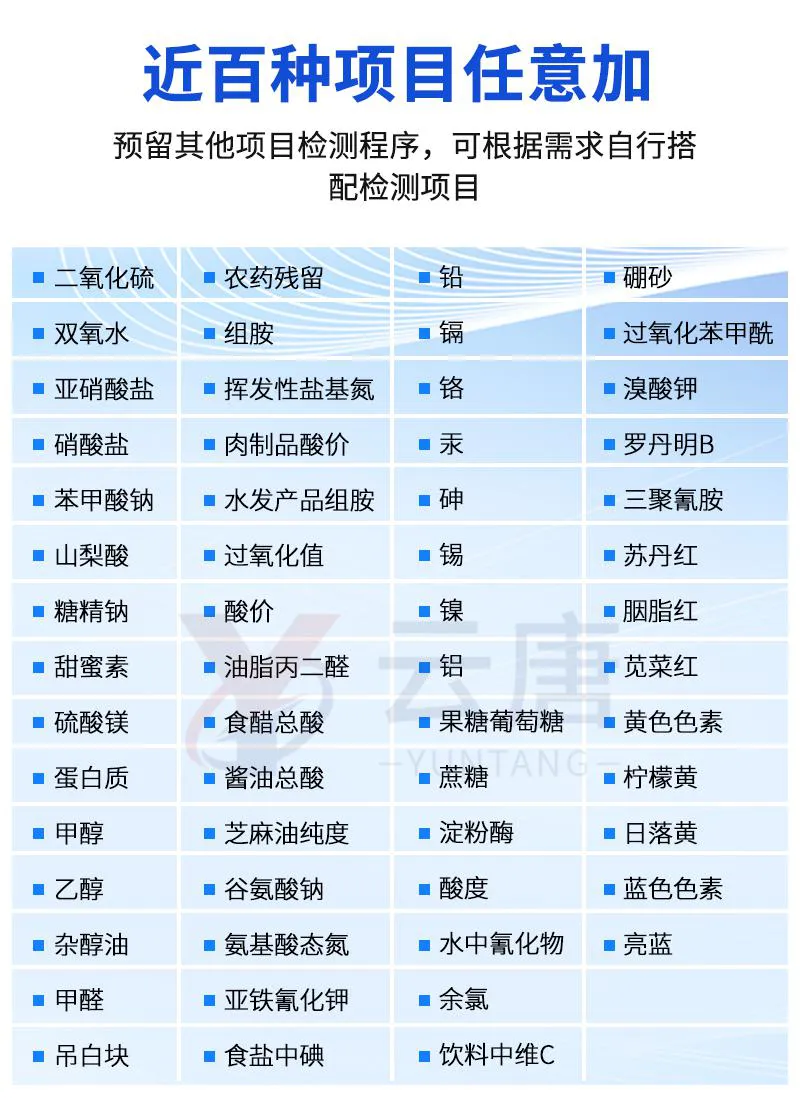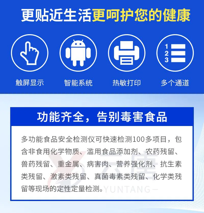 多功能食品安全檢測(cè)儀可快速檢測(cè)60多項(xiàng)目,包含非食用化學(xué)物質(zhì)、濫用食品添加劑、農(nóng)藥殘留、獸藥殘留、重金屬、病害肉、營(yíng)養(yǎng)強(qiáng)化劑、抗生素類(lèi)殘留、激素類(lèi)殘留、真菌毒素類(lèi)殘留、化學(xué)類(lèi)殘留等現(xiàn)場(chǎng)的定性定量檢測(cè)。