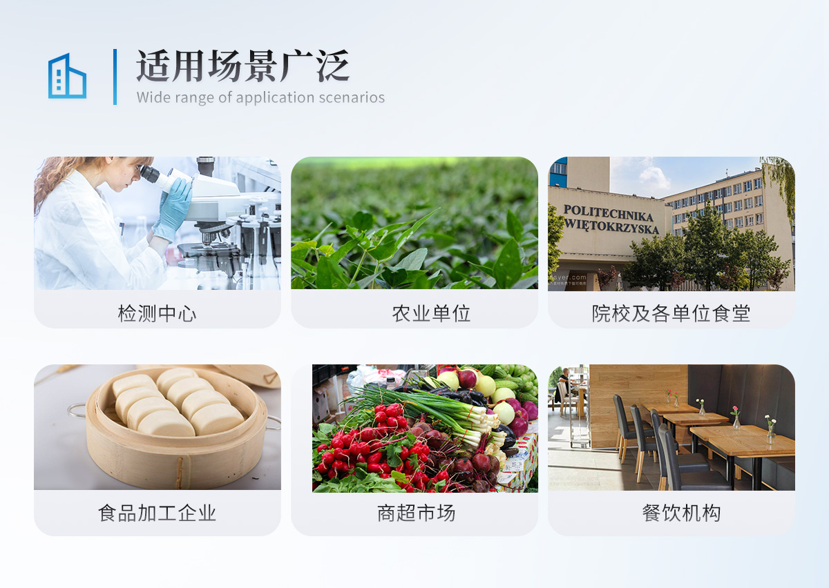 廣泛應(yīng)用于食品深加工企業(yè)、食藥監(jiān)局、商場(chǎng)超市、質(zhì)量監(jiān)督檢驗(yàn)、工商管理、餐飲檢測(cè)、各大食品安全監(jiān)測(cè)系統(tǒng)等單位使用。