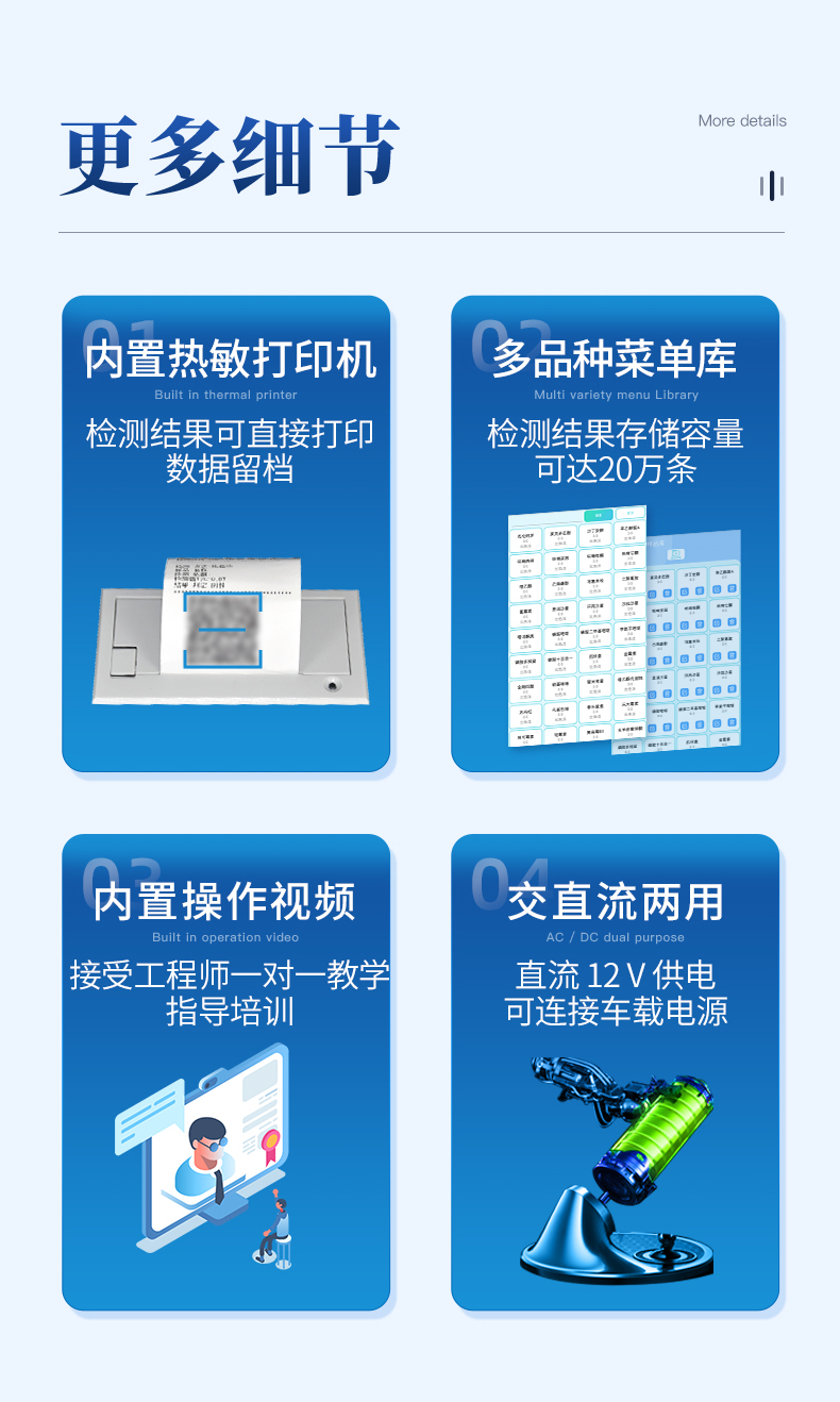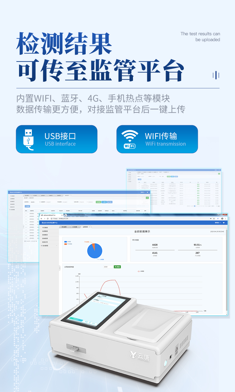 儀器檢測系統(tǒng)擁有龐大數(shù)據(jù)庫,并且構(gòu)建了完善的檢索、修訂功能。食品庫涵蓋多種樣品名稱,可按需添加或刪除、編輯樣品名稱;產(chǎn)品數(shù)據(jù)庫以及歷史檢測記錄支持一鍵檢索功能。系統(tǒng)打印自定義化,打印格式多樣化,產(chǎn)品合格證(國家標準要求),二維碼,抽樣信息、檢測信息,受檢信息、復核信息、抽樣日期、檢測日期等信息結(jié)果,可按需求自行設(shè)置打印內(nèi)容。A4紙版本報告打印功能(可選配):設(shè)備擁有兩種結(jié)果展示方式,可以自動生成A4打印模板和小票打印模板兩種樣式,可通過WiFi及網(wǎng)線等方式鏈接外置打印機可進行打印儀器具有 wifi 聯(lián)網(wǎng)上傳、RJ45網(wǎng)線連接功能,可以快速上傳數(shù)據(jù)。同步對接監(jiān)管平臺,數(shù)據(jù)可局域網(wǎng)和互聯(lián)網(wǎng)數(shù)據(jù)上傳,檢測結(jié)果直接傳至食品安全監(jiān)管平臺。進行區(qū)域食品安全監(jiān)管及大數(shù)據(jù)分析處理與數(shù)據(jù)統(tǒng)計,檢測區(qū)域食品安全長短期動態(tài),達到食品安全問題預估、預警。設(shè)備支持U盤存儲,標準USB接口,免驅(qū)動安裝。檢測結(jié)果存儲容量20萬條以上,可生成Excel表格,進行一鍵拷貝,并具有登錄保護功能,可設(shè)置用戶名及密碼,規(guī)范不同人員操作權(quán)限,防止非工作人員操作,并且可以進行重新校準、鎖定、恢復出廠設(shè)置功能。儀器固件可升級,后期檢測項目可擴充。儀器具備遠程升級功能,可定向分客戶分儀器更新,開機后自動更新,并可持續(xù)性免費更新系統(tǒng)版本,無需像傳統(tǒng)產(chǎn)品返廠更新,節(jié)省時間及人力成本并避免了物流運輸返廠升級導致設(shè)備損壞的潛在風險。