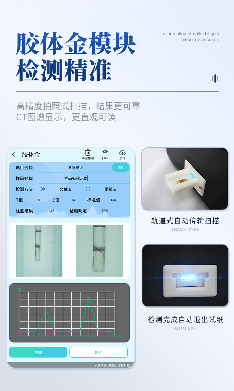 直插式自動掃描方式,可實時顯示金標卡實時圖像,系統(tǒng)自動分析并呈現(xiàn)出CT曲線圖,CT線自動識別,無需手動調(diào)整,完成檢測后自動退出檢測卡。