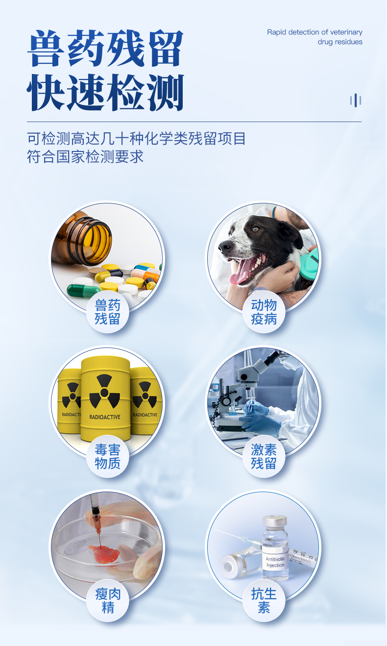 瘦肉精激素:鹽酸克倫特羅、沙丁胺醇、萊克多巴胺、己烯雌酚等抗生素殘留:四環(huán)素類、硝基呋喃類、磺胺類、β-興奮劑類、沙星類、磺胺類、喹諾酮類,甲砜霉素,氟苯尼考,金剛烷胺、替米考星、慶大霉素、林可霉素、鏈霉素、恩諾沙星、環(huán)丙沙星、頭孢啦啶、青霉素、阿莫西林等水產(chǎn)品安全類:孔雀石綠、氯霉素、呋喃妥因、呋喃西林、呋喃它酮、呋喃唑酮等蛋類藥物殘留:氯霉素,四環(huán)素,磺胺類,喹諾酮類,呋喃西林,呋喃它酮,呋喃妥因,呋喃唑酮,氟苯尼考,阿莫西林、頭孢氨芐、紅霉素、鏈霉素等動物疫病類:禽流感、新城疫、牛羊口蹄疫、牛羊結(jié)核病、牛羊包蟲、牛羊布病、小反芻獸、豬藍耳病毒、豬瘟病毒、豬偽狂犬病毒、豬細小、豬圓環(huán)、犬細小病毒、犬瘟熱病毒、犬狂犬病毒等真菌毒素殘留:食用油、糧食及飼料中黃曲霉毒素B1、黃曲霉毒素總量,奶中黃曲霉毒素M1、嘔吐毒素、玉米赤霉烯酮、赭曲霉毒素A、T2毒素、伏馬毒素等