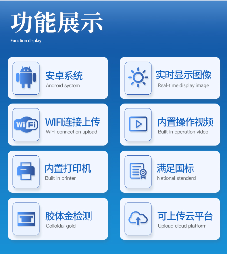 儀器采用10.1英寸液晶觸摸屏顯,搭配運行安卓智能操作系統(tǒng),主控芯片采用ARM Cortex-A7,RK3288/4核處理器,主頻1.88Ghz,運轉(zhuǎn)速度更快速,性能更強。儀器功能包括:膠體金檢測模塊、數(shù)字化管理模塊、無線通訊模塊等,可以滿足同一軟件下實現(xiàn)所有檢測項目的檢測,并在同一窗口展示檢測結(jié)果。一體化便攜式快檢設(shè)備,采用交直流兩用供電方式,可連接車載電源,配備6ah大容量充電鋰電池,可以滿足現(xiàn)場及流動檢測使用的需求。儀器尺寸:43×35×20cm,   主機凈重:5.1kg系統(tǒng)自帶數(shù)據(jù)集成模塊,設(shè)備首頁自動統(tǒng)計檢測數(shù)據(jù)包含:周檢測數(shù)據(jù)、月檢測數(shù)據(jù),全部檢測總數(shù)量,均包含檢測總數(shù),合格數(shù),不合格數(shù),以及相關(guān)柱形分析圖,對各項檢測數(shù)據(jù)清晰掌握,無需電腦查詢,更加快捷直觀。儀器具有任務(wù)預設(shè)模塊,可在樣品送檢前提前預設(shè)樣品名稱、檢測指標、送檢單位等信息,樣品送檢時一鍵調(diào)取保存信息,檢測更加方便快捷。膠體金檢測模塊: