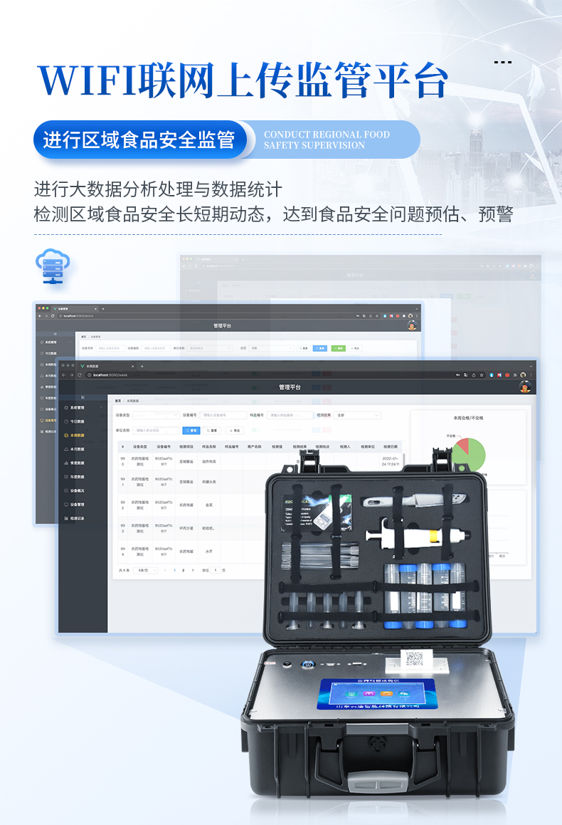 5、儀器帶有監(jiān)管平臺,數(shù)據(jù)可局域網(wǎng)和互聯(lián)網(wǎng)數(shù)據(jù)上傳,檢測結(jié)果直接傳至食品安全監(jiān)管平臺。進(jìn)行區(qū)域食品安全監(jiān)管及大數(shù)據(jù)分析處理與數(shù)據(jù)統(tǒng)計,檢測區(qū)域食品安全長短期動態(tài),達(dá)到食品安全問題預(yù)估、預(yù)警