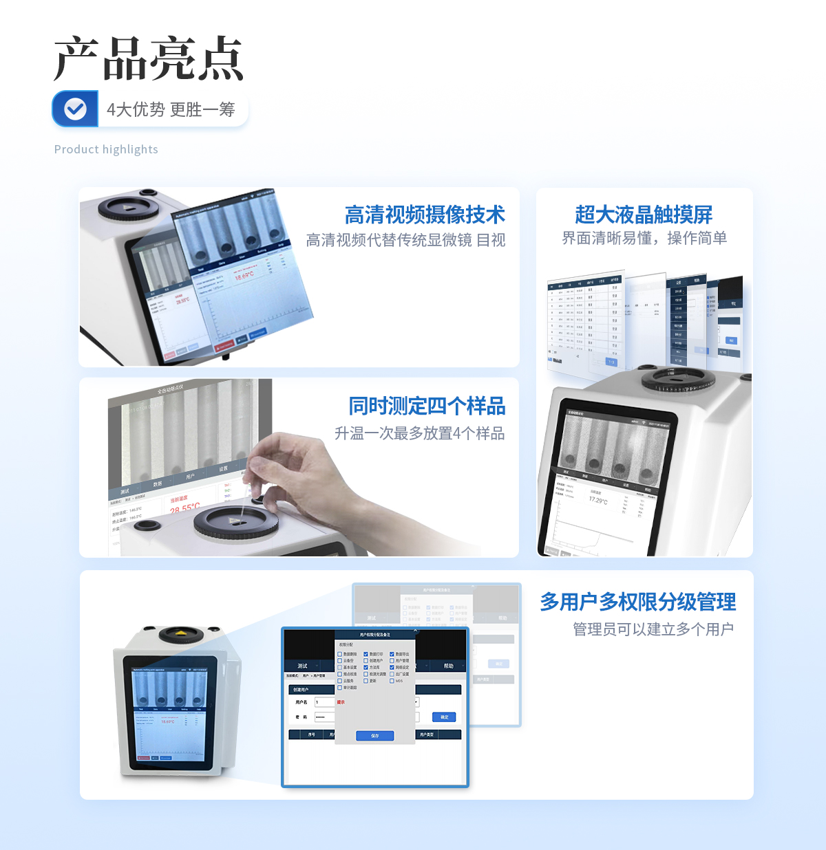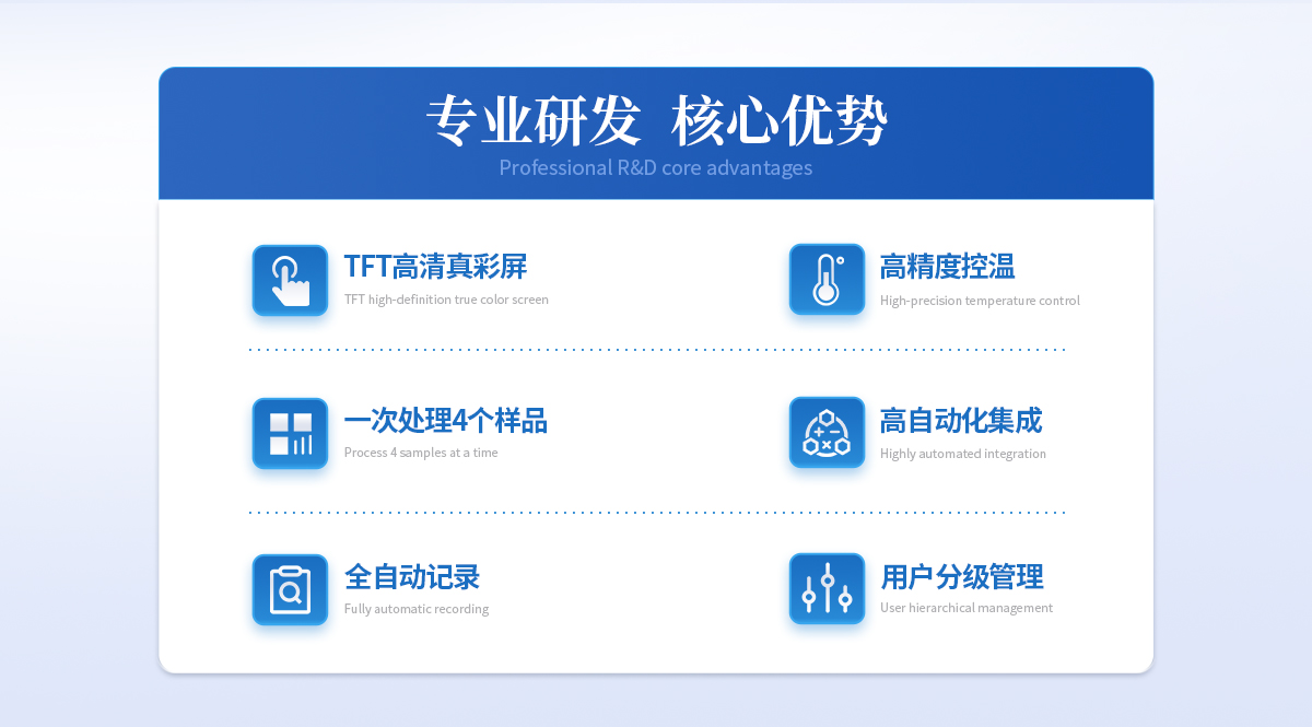| 升溫一次*多放置4個樣品,與傳統(tǒng)測量方法相比工作效率提高4倍,且4組數(shù)據(jù)分別記錄實現(xiàn)對歷史數(shù)據(jù)的追溯,符合FDA 21CFR11確保出具報告的可信度。 |