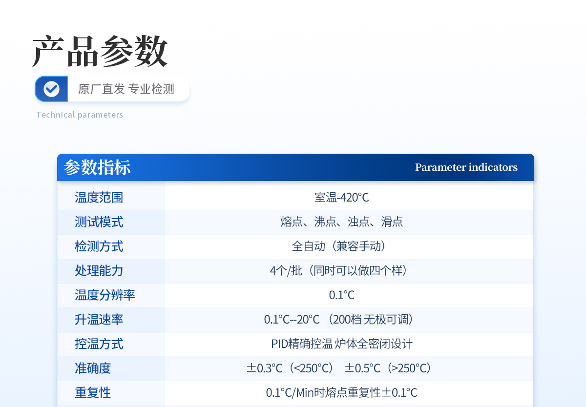 | 1、自動化集成,實現(xiàn)一鍵測定功能; | 2、一次處理4個樣品; | 3、高清視頻代替?zhèn)鹘y(tǒng)顯微鏡 目視高; | 4、全自動記錄熔程,初熔,終熔; | 5、可通過打印機直接打印數(shù)據(jù)。 |