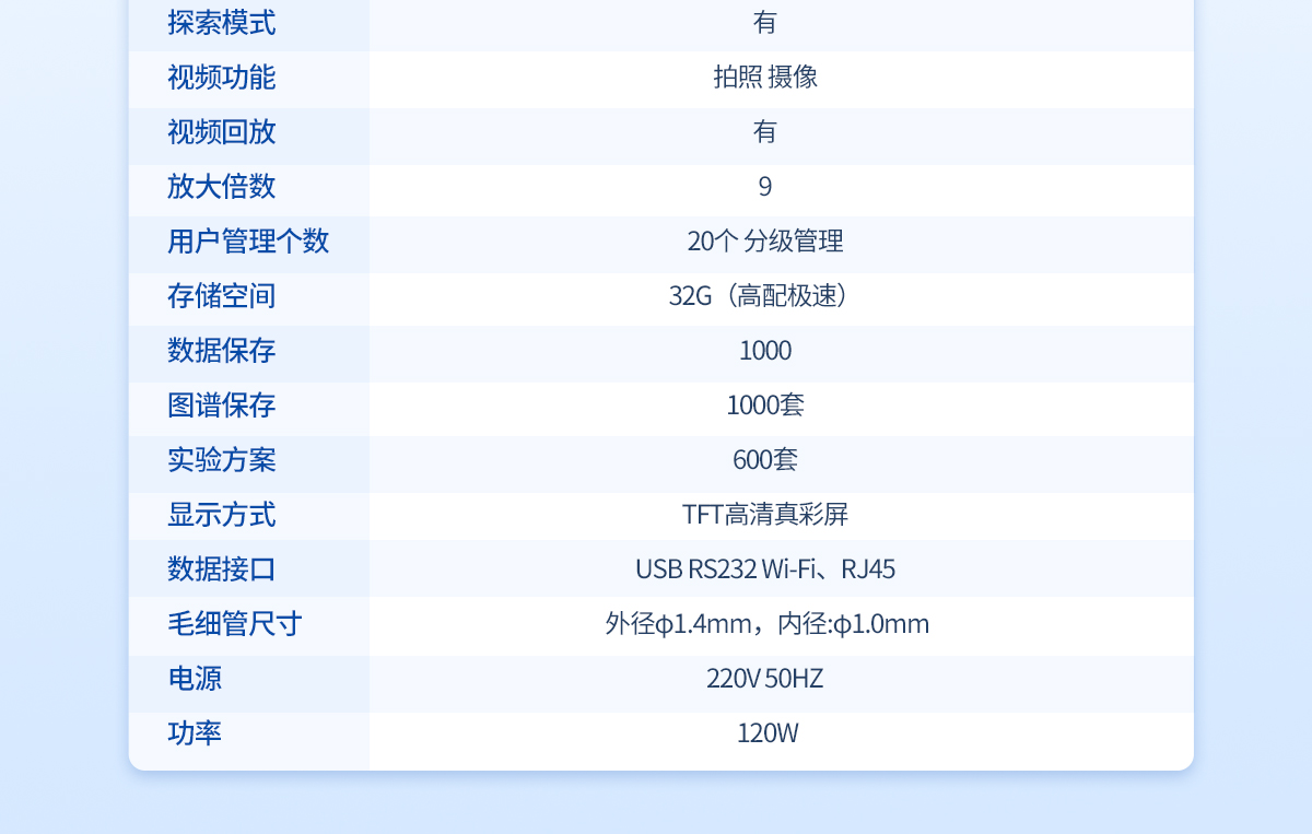 | 溫度范圍: 室溫-420℃ | 檢測方式: 全自動(兼容手動) | 處理能力: 4個/批(同時可以做四個樣) | 溫度分辨率:0.01℃ | 控溫方式: PID**控溫 爐體全密閉設(shè)計 | 準(zhǔn)確度: ±0.2℃(<200℃),±0.4℃(>200℃) | 加熱方式:電熱塊空氣加熱法 | 升溫分辨率:≤0.1℃ | 升溫速率::0.1℃/Min--20℃/Min | 準(zhǔn)確度:±0.2℃(<200℃)、±0.4℃(>200℃) | 重復(fù)性: 0.1℃/Min時熔點重復(fù)性±0.1℃ | 探索模式: 有 | 視頻功能: 拍照 攝像 | 視頻回放: 有 | 放大倍數(shù): 10 | 用戶管理個數(shù):500個以上,分四級管理 | 數(shù)據(jù)保存: 800套 | 實驗方案存儲:100套 | 打 印 機: 通用型 | 存儲空間: 128G(高配極速) | 顯示方式: 10寸TFT高清真彩屏 | 數(shù)據(jù)接口: USB RS232 Wi-Fi、RJ45 | 毛細管尺寸: 外徑φ1.4mm,內(nèi)徑:φ1.0m | 電源:220V 50HZ 功率:120W |