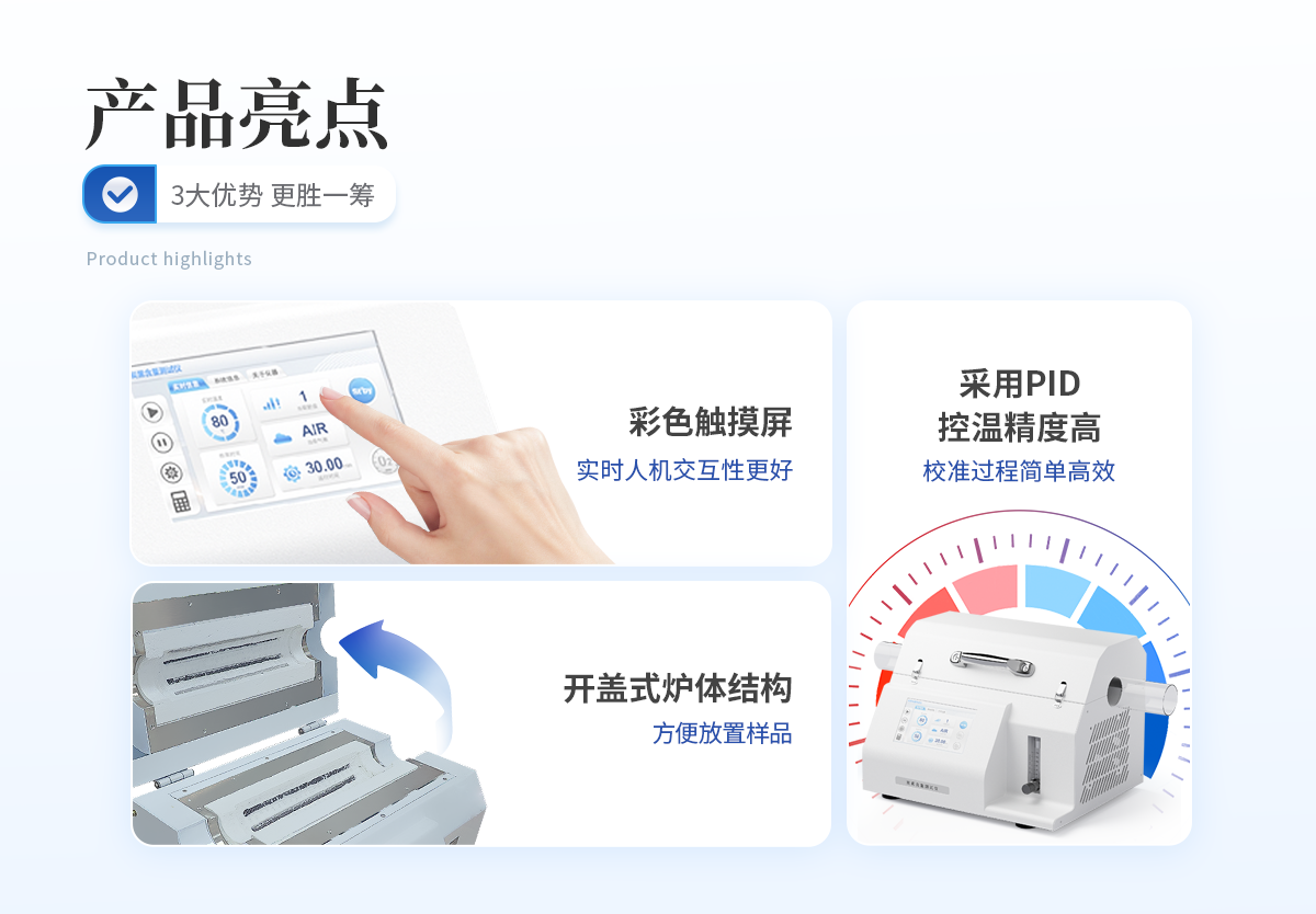 | 1. 采用開蓋式爐體結(jié)構(gòu),方便放置樣品且散熱效果更佳。 | 2. 爐膛采用超長加熱單元,可同時測試4組樣品,大大提高測試效率。 | 3. 軟件自帶計算功能,可以一鍵自動計算出炭黑含量、灰分含量,非常得方便快捷。 | 4. 采用PID精準控溫,控溫精度高,溫度范圍大,爐膛溫度均勻性高。 | 5. 7寸液晶觸摸屏顯示,可一鍵操作啟動,設(shè)定恒溫時間,恒溫精度高; | 6. 智能化可編程控制,可設(shè)置多組分段升溫程序。 |