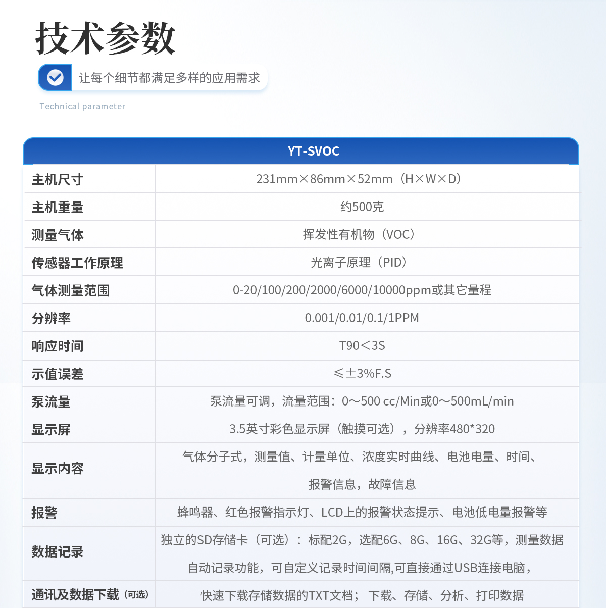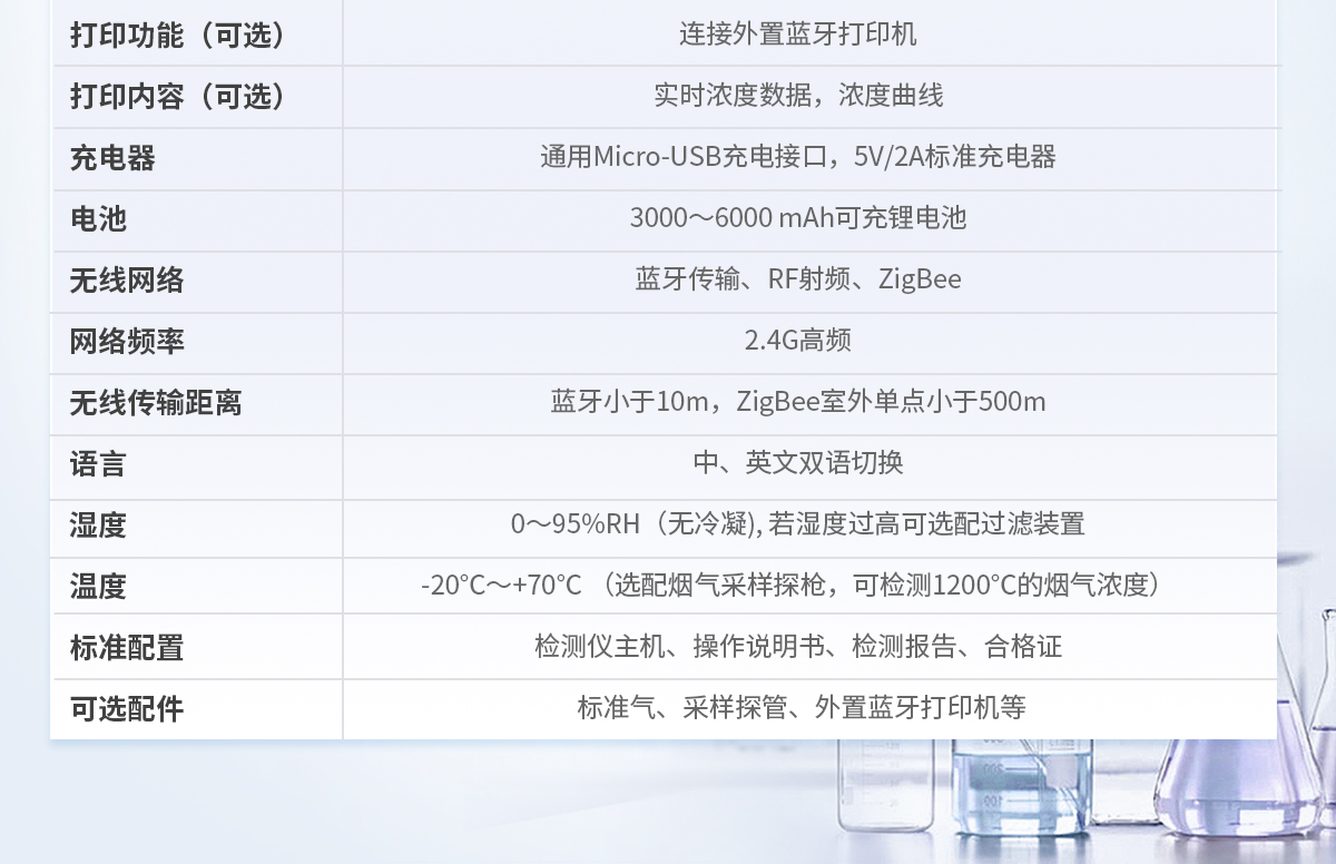 主機(jī)尺寸:(H x W x D)231*86*52mm 主機(jī)重量:約500克 測(cè)量氣體:揮發(fā)性有機(jī)物(VOC) 傳感器工作原理:光離子原理(PID); 氣體測(cè)量范圍 :0-20/100/200/2000/6000/10000ppm或其它量程 分辨率:0.001/0.01/0.1/1PPM 響應(yīng)時(shí)間 :T90<3S 示值誤差: ≤±3%F.S 泵流量:泵流量可調(diào),流量范圍:0~500 cc/Min或0~500mL/min 顯示屏:3.5寸彩色顯示屏(觸摸可選),分辨率480*320 顯示內(nèi)容:氣體分子式,測(cè)量值、計(jì)量單位、濃度實(shí)時(shí)曲線、電池電量、時(shí)間、報(bào)警信息,故障信息 報(bào) 警:蜂鳴器、紅色報(bào)警指示燈、LCD上的報(bào)警狀態(tài)提示、電池低電量報(bào)警等 數(shù)據(jù)記錄:獨(dú)立的SD存儲(chǔ)卡(可選):標(biāo)配2G,選配6G、8G、16G、32G等 測(cè)量數(shù)據(jù)自動(dòng)記錄功能,可自定義記錄時(shí)間間隔 通訊及數(shù)據(jù)下載 (可選):可直接通過(guò)USB連接電腦,快速下載存儲(chǔ)數(shù)據(jù)的TXT文檔; 下載、存儲(chǔ)、分析、打印數(shù)據(jù) 打印功能(可選):連接外置藍(lán)牙打印機(jī) 打印內(nèi)容(可選):實(shí)時(shí)濃度數(shù)據(jù), 濃度曲線 充電器:通用Micro-USB充電接口,5V/2A標(biāo)準(zhǔn)充電器 電池:3000~6000 mAh可充鋰電池 無(wú)線網(wǎng)絡(luò):藍(lán)牙傳輸、RF射頻、ZigBee 網(wǎng)絡(luò)頻率 :2.4G高頻 無(wú)線傳輸距離 :藍(lán)牙小于10m,ZigBee室外單點(diǎn)小于500m 語(yǔ) 言:中、英文雙語(yǔ)切換 濕 度:0~95%RH(無(wú)冷凝), 若濕度過(guò)高可選配過(guò)濾裝置 溫 度:-20℃~ +70℃ (選配煙氣采樣探槍,可檢測(cè)1200℃的煙氣濃度)