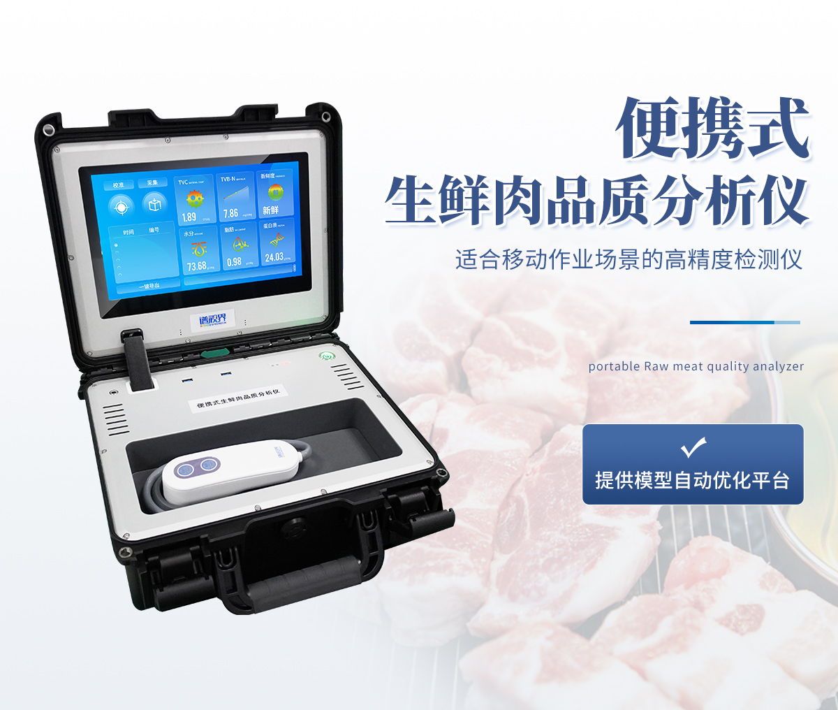 可用于檢測(cè)生鮮肉的蛋白質(zhì)、脂肪、水分、pH、TVC、TVB-N、新鮮度、L*、A*、B*等品質(zhì)參數(shù)。配備手提箱式防水減震外殼、大尺寸觸控屏幕并內(nèi)置大容量電池,可一鍵自動(dòng)校準(zhǔn),是一款適合移動(dòng)作業(yè)場(chǎng)景的高精度生鮮肉品質(zhì)檢測(cè)儀,其可用于生鮮肉及肉品生產(chǎn)、加工、儲(chǔ)運(yùn)企業(yè)、肉品品質(zhì)監(jiān)管部門等。