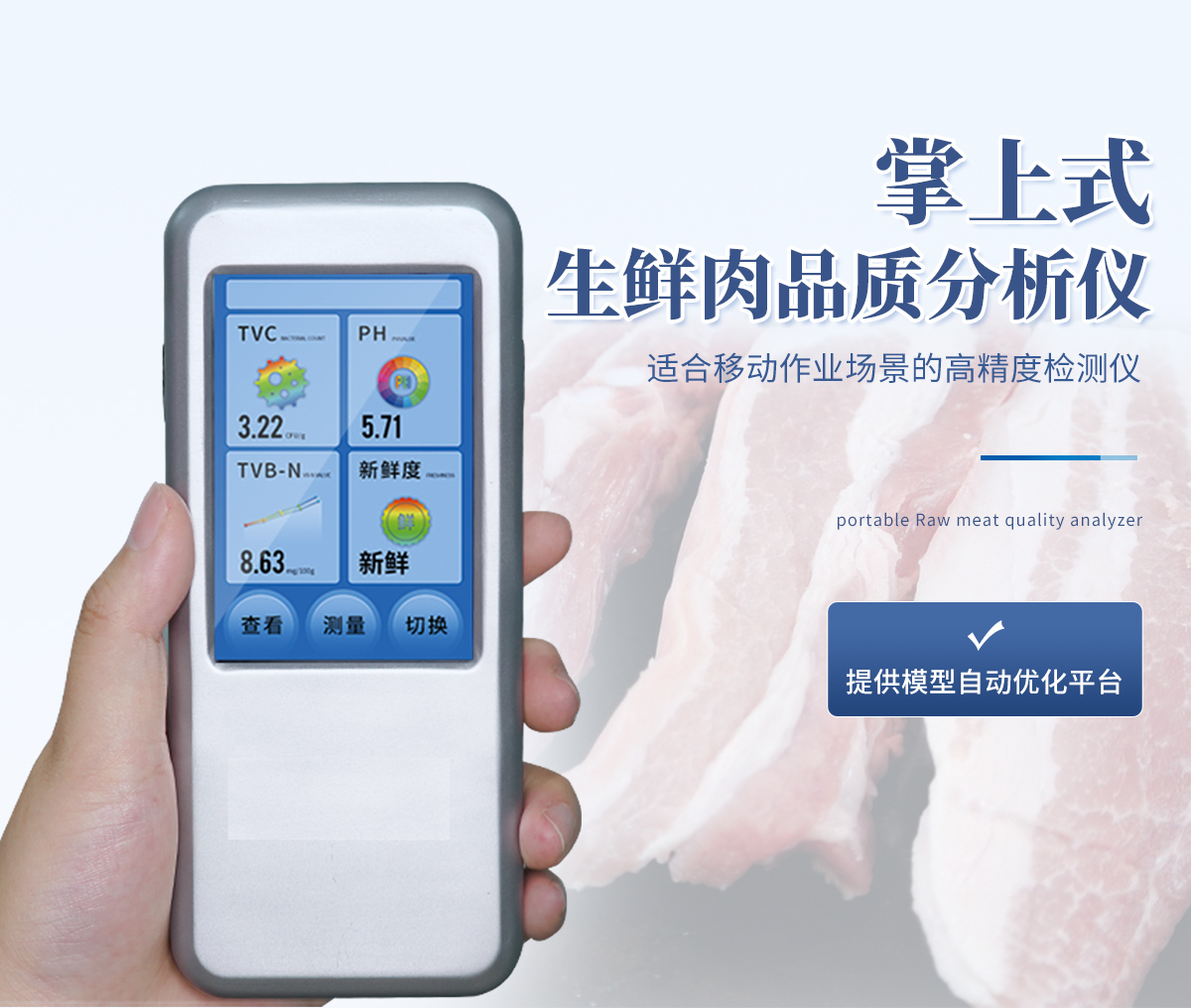 聯(lián)合中國農(nóng)業(yè)大學(xué)彭彥昆教授團隊研發(fā)的掌上式生鮮肉新鮮度分析儀,可用于檢測生鮮肉的TVC、pH、TVB-N、新鮮度、L*、A*、B*等評價指標。Palmarter具有體積小、便 于攜帶、性價比高等特點,其應(yīng)用場景包括但不限于肉儲運企業(yè)、肉品品質(zhì)監(jiān)管部門、飯店、超市、菜場、家庭等。