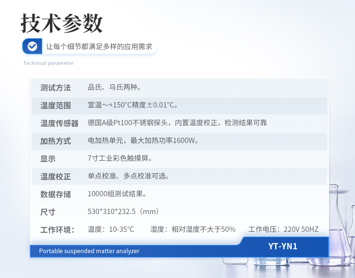 測試方法:品氏、烏氏兩種。 溫度范圍:室溫~+150°C精度±0.01°C。 溫度傳感器:德國A級Pt100不銹鋼探頭,內(nèi)置溫度校正,檢測結(jié)果可靠。 加熱方式:電加熱單元,**加熱功率1600W。 顯示:7寸工業(yè)彩色觸摸屏。 溫度校正:單點校準(zhǔn)、多點校準(zhǔn)可選。 數(shù)據(jù)存儲:10000組測試結(jié)果。 尺寸:530*310*232.5(mm) 工作環(huán)境: 溫 度:10-35℃ 濕 度:相對濕度不大于50% 工作電壓:220V 50HZ