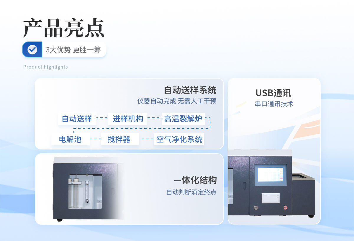 | 1、 手自一體化自動送樣系統(tǒng),將自動送樣、進樣機構、高溫裂解爐、電解池、攪拌器、空氣凈化系統(tǒng)等部件巧妙地結合在一起,使儀器結構更加緊湊,更加合理、更加穩(wěn)定。可在線式插隊添加樣品,無需人工送樣,自動化程度高,若樣品少也可采用手動送樣方式。 | 2、采用—體化結構,自動判斷滴定終點,縮短了實驗時間。所有關鍵部件均采用了設計理念及進行了嚴格的控制,確保儀器能長時間穩(wěn)定運行。 | 3、采用特別的數據采集網絡及多級校正技術,確保高、中、低硫含量測試結果的準確性。 | 4、送樣機構采用電子電解液分子濃度采集電路,可靠性高,不會產生過電解現象。 | 5、串口通訊技術,可采用usb通訊,兼容性好,具有廣泛的適用性。 | 6、自由設置送樣時間及預置溫度,采用進口霍爾元件控制送樣位置。 | 7、采用剛玉瓷舟,減少卡樣的可能。一次可放1-24個樣由程序控制實現自動升溫、控溫、送樣、測定,結果自動存盤、自動打印,并可中途在線式插隊添加試樣,大大地提高了工作效率,真正實現無人值守; | 8、采用庫侖滴定法進行測定,測定時間可根據不同試樣自動判斷,速度優(yōu)于艾士卡重量分析法和高溫燃燒中和法; |
